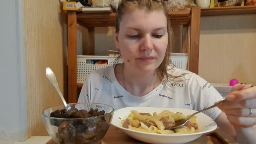 МУКБАНГ. МАКАРОНЫ С ГУЛЯШОМ, МАРИНОВАННЫЕ ЗЕЛЕНУШКИ!