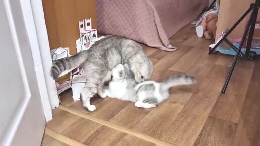 Так мило Кошка мама продолжает кормить молоком своих взрослых котят