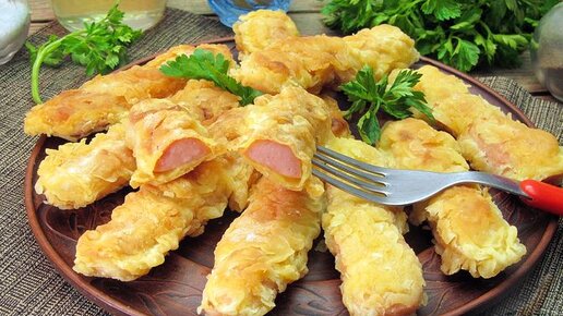 В "ленивом тесте" готовятся очень быстро и просто. Жареные сосиски в панировке.
