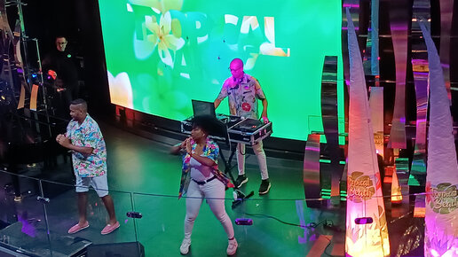 Экзотический вечер на корабле. Рекомендуемая форма одежды - экзотика. Раздавали гирлянды, но я не успела поймать.