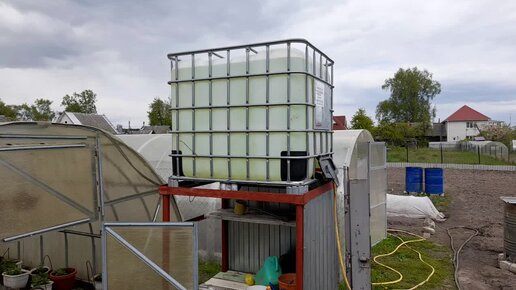Самодельная подставка под еврокуб для полива, с полочками для садового инвентаря.