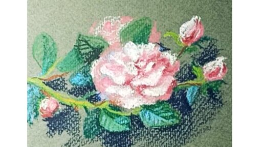 🌸🌺🌸Бело-розовый цветок шиповника, нарисованный пастелью на серой бумаге. ✏️🖍✏️🖍