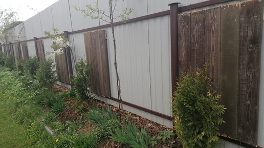 Щиты для туи после пересадки, чтобы не сгорели от горячего забора из металла. Май 2023