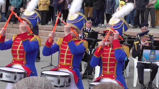 Барабанщицы играют на барабанах в городе. Городской парк, город Орёл