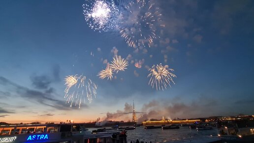 Салют в честь дня Победы с борта теплохода в Санкт-Петербурге.