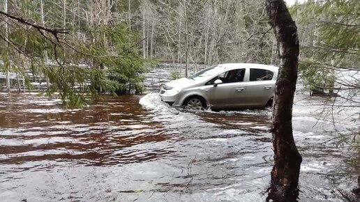 Куда только не заведет навигатор - Опель Корса едет против течения по реке - разлив Янисйоки в Карелии