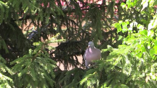 Вяхирь вьет гнездо, собирает веточки для домика в конце апреля
