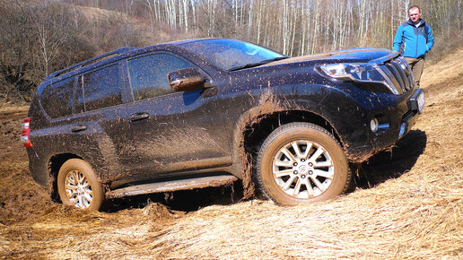 Toyota Land Cruiser Prado выжимая все соки из ДВС заезжает в небольшую гору. Едешь на бездорожье купи нормальную резину