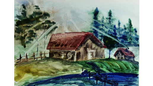 Как нарисовать деревенский пейзаж. Как легко нарисовать пейзаж акварелью. Рисуем домик у реки.