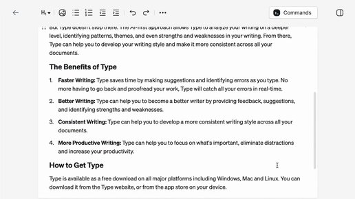 Type — первый ИИ-редактор текста Это первый редактор документов с искусственным интеллектом, который помогает моментально писать тексты.