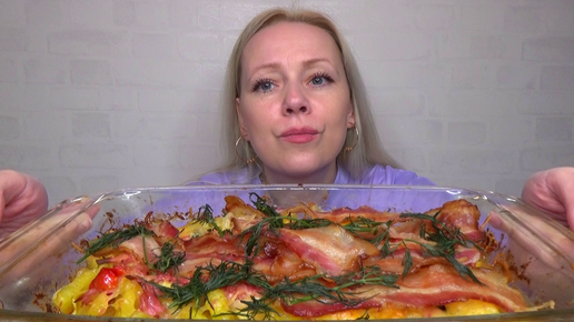 Мукбанг. Запеканка с картошкой, кабачками, болгарским перцем и беконом. еда.