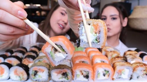 МУКБАНГ с сестрой Родители не дают жить! Огромные роллы, вкусный сет лосось угорь mukbang sushi roll