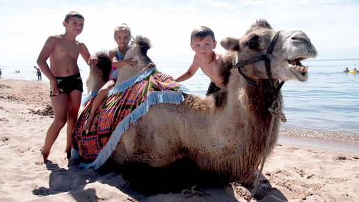 Катаемся на верблюде по берегу Иссык-Куля в Чок-Тале. Пансионат Лазурный берег, Иссык-Куль. Отдых на Иссык-Куле