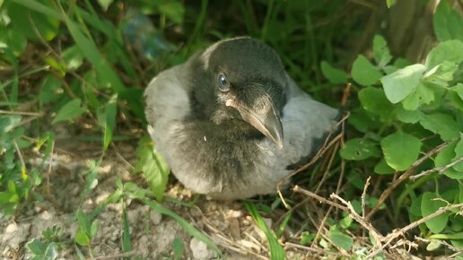 Вороненок выпал из гнезда. Родители настороже.