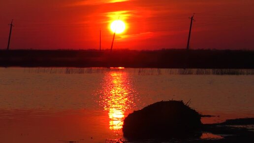 Шумный вечер на деревенском озере где май нет рыбалки на карася хищные чайки охотятся поверхность воды за рыбой яркий красный закат солнца