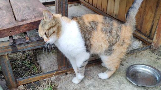 Радостная встреча с бездомной кошкой, которая живет на дачах одна. Приехали на дачу, а кошка прибежала, трется, и радуется нашему приезду