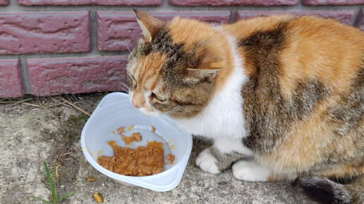 Только приехали на дачу, и сразу накормили бездомную кошку кормом Феликс. Кошка ест второй пакетик кошачьего корма за обе щеки и радуется