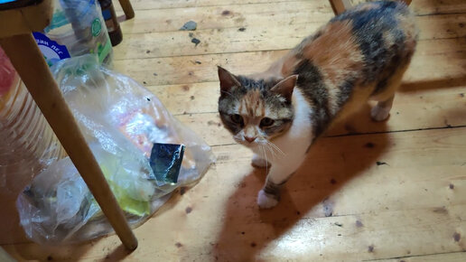Бездомная кошка живет у нас в доме на даче и просит с утра поесть. Утренняя подкормка кошки мокрым кормом Kitiket. Кошка голодная завтракает