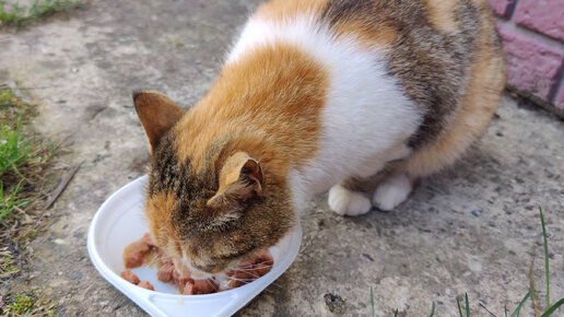 Бездомная кошка первый раз пробует корм Katty говядина и ягненок. Пустили кошку в дом, а она проснулась и стала просить есть. Угощаем кошку