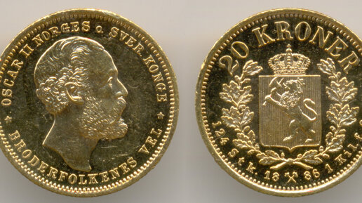 Нумизматика. Золотая монета. Норвегия, 20 крон 1886 года.