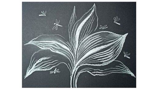 Карандашный рисунок листьев хосты на чёрной бумаге.