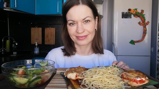 МУКБАНГ МЯСО ПО-ФРАНЦУЗСКИ, СПАГЕТТИ, САЛАТ/MUKBANG HALK FAMILY ЕДА ОБЖОР
