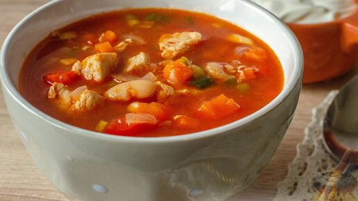 Вкусное первое блюдо, которое вы приготовите очень быстро. Томатный суп с курицей.