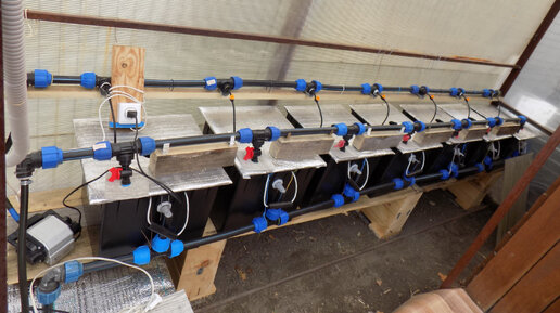 Гидропонная установка, состоящая из 7 аквапотов с автоматическим поддержанием уровня, собрана.