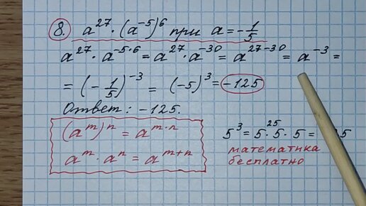 8) Найдите значение выражения а^27•(а^-5)^6 при а=-1/3. ОГЭ по математике 2023. Канал Математика бесплатно.