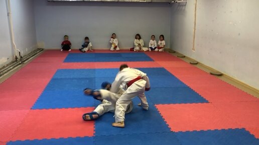 Встречный бросок с подсечкой и добиванием в каратэ wkf.