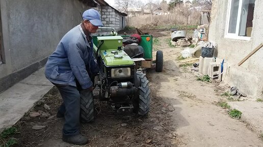 Старик заводит свой любимый мотоблок