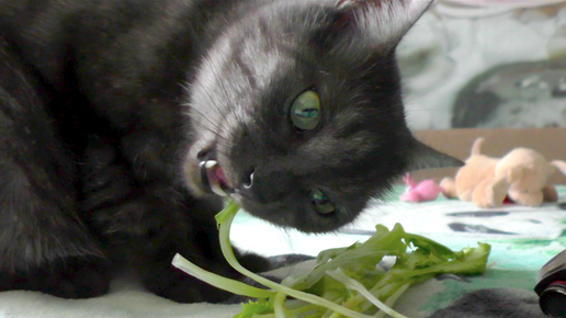Котик аппетитно хрустит листьями салата, АСМР. Слушайте в наушниках.