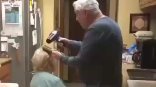 Муж прямо на кухне делает прическу своей жене.
