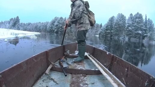 Еду на лодке.Проверяю сети.Завалило снегом.