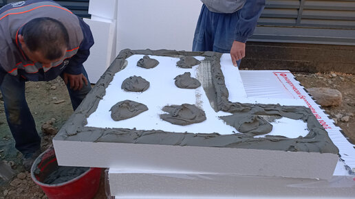 Как производится приклейка первых листов пенопласта вокруг оконных блоков, верхние Гешки. Вырезаем, наносим клей, приклеиваем на фасад