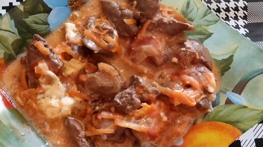 Куриная печеночка, тушенная в сметане и томатной пасте.