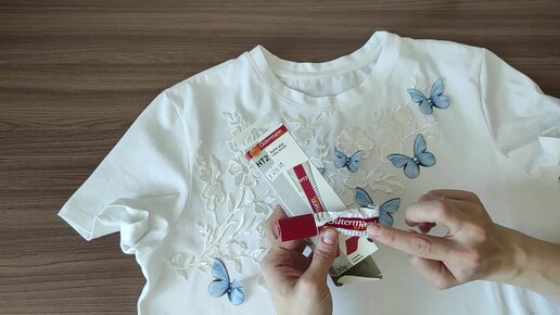 Обзор футболки с бабочками. Декор кружевом. Клей для страз. Клей для ткани.