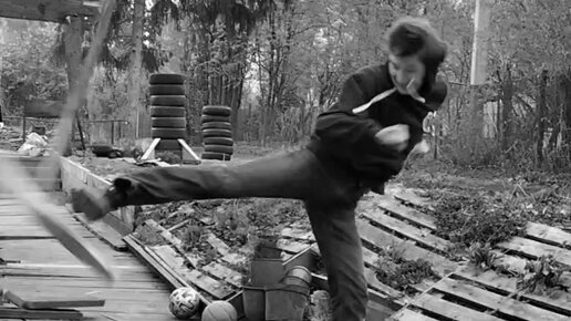 Йоко-гери в прыжке с разворота на 180 и 360 градусов.