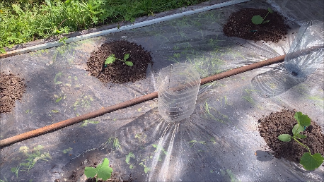Высадила кабачки на плёнку и установила бутылки для полива.
