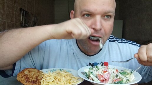 ОБЖОР Бифштексы и спагетти/мукбанг салат из овощей с майонезом