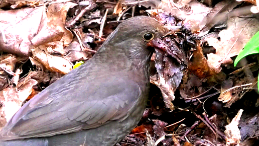 Чёрный дрозд. Самка собирает материал для гнезда.