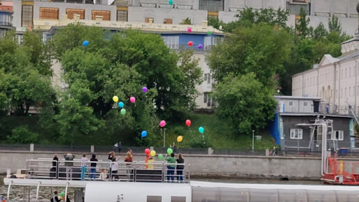 Выпустили в небо разноцветные шары с теплохода на Москве реке. Наблюдаю с набережной за проплывающими кораблями. Велопрогулка на выходных