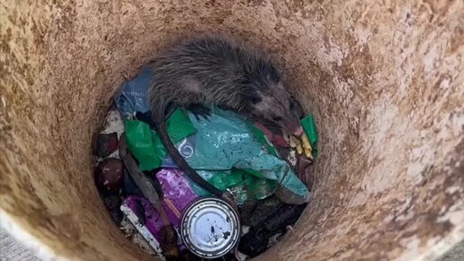 Спасение опоссума попавшего в мусорный бак