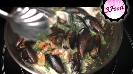 Мидии "3food" жареные с креветками под сливочным соусом и сыром с брускеттами из томатов с базиликом.
