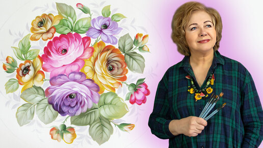 Живописные цветы. Композиция в круге в Жостовской росписи. Художник Лариса Гончарова
