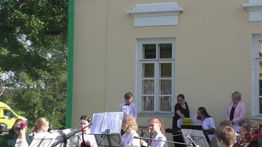 Обратите внимание на скромного парня, который стоит на углу здания музея. Скоро он исполнит "Галоп" из сюиты "Комедианты" на металлофоне