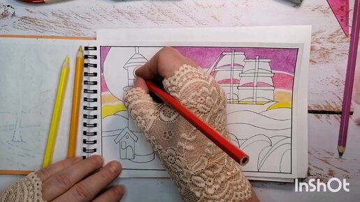 Маяк и парусник - рисую простую иллюстрацию цветными карандашами