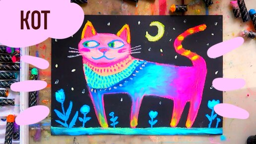 Как нарисовать радужного кота масляной пастелью, пошаговый урок