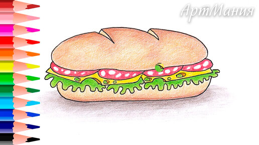 Бутерброд с колбасой и сыром - Рисунок цветными карандашами
