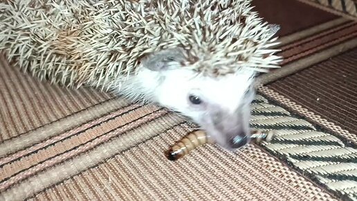 Ежиха забавно чавкает поедая насекомых. Ежик наносит языком пену на иглы. Фырчит на руках.